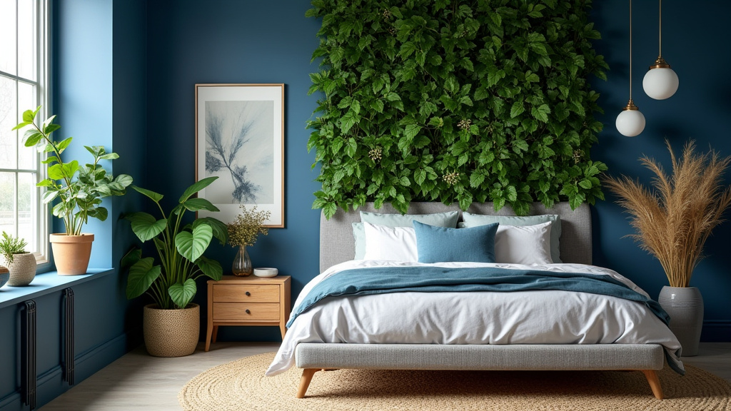 Embrace nature in this biophilic design blue bedroom, featuring an urban jungle palette that invites the outdoors in. A living plant wall becomes a stunning focal point, promoting a sense of well-being and connection to nature.